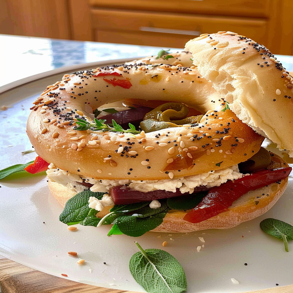 Bagel with Olive Tapenade Roasted Pepper Fresh Herbs is a culinary masterpiece that brings together delightful flavors in every bite. Imagine biting into a warm,