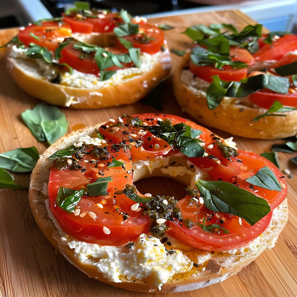 The aroma of a freshly toasted bagel wafts through the air, mingling with the spicy notes of tomato and herbs, creating a culinary symphony that