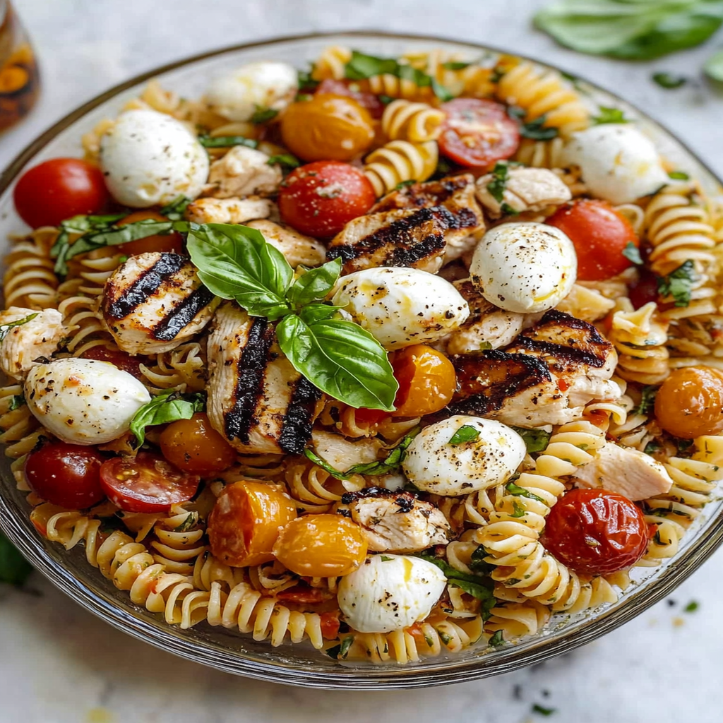 Layered Grilled Chicken Caprese Pasta Salad is a colorful and delicious dish that combines the vibrant flavors of summer. Featuring juicy grilled chicken, creamy mozzarella, sweet cherry tomatoes, and fragrant basil over al dente pasta, this salad is perfect for picnics, barbecues, or meal prep. Easy to assemble and visually stunning, it’s a crowd-pleaser enjoyed warm or cold. Dive into this refreshing recipe and impress your family and friends with a delightful taste of summer!