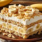 Banana pudding cake is a nostalgic dessert that perfectly blends the creamy flavor of traditional banana pudding with light, fluffy cake layers. Each slice reveals moist cake infused with ripe bananas, layered with velvety vanilla pudding, and topped with whipped cream and crushed vanilla wafers. Ideal for gatherings, barbecues, or cozy nights at home, this delightful treat is sure to bring joy and fond memories to every occasion.